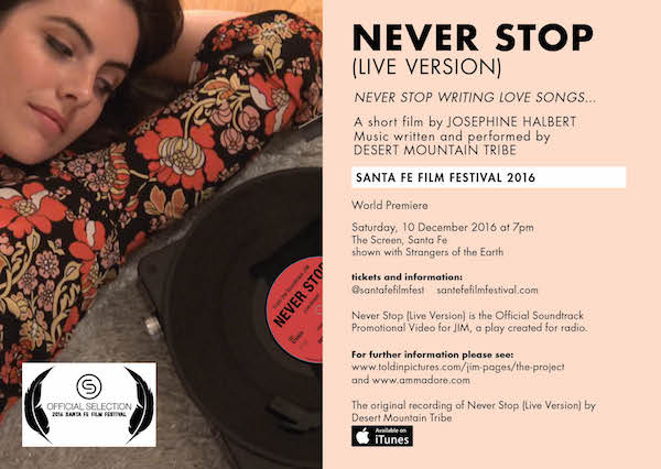 If you are in Santa Fe, please come and watch the World Premiere of Never Stop (Live Version) at The Screen in Santa Fe! All details are on the flyer here! I am really looking forward to attending the screening and going to Santa Fe. A big thank you to the Santa Fe Film Festival for including this short film/music video that I directed in the 2016 Official Selection!